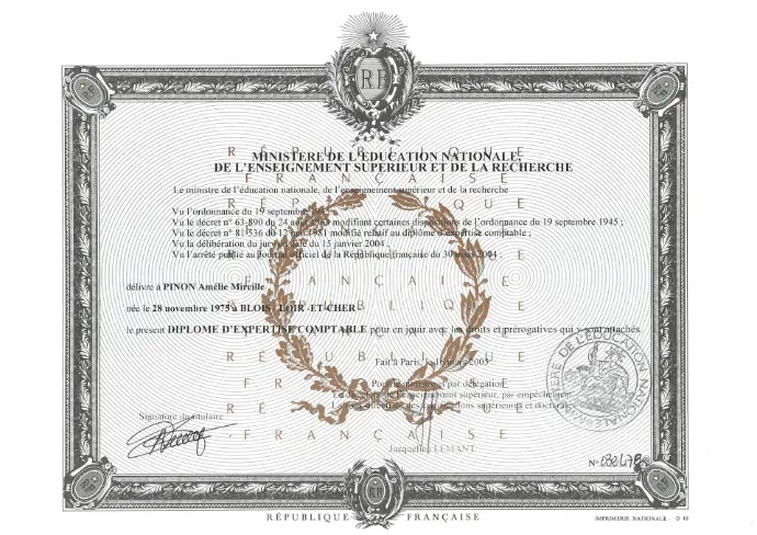 Amélie PINON est diplômée d'expertise comptable en 2004 et a été inscrite auprès de l'Ordre des Experts-comptables de 2005 à 2021.